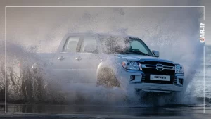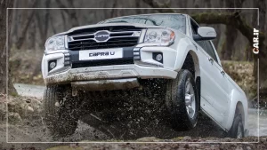 زاویه ورود ۲۱ درجه و زاویه خروج ۲۸ درجه به این پیکاپ کمک میکند تا عبور از مسیرهای ناهموار را بهتر مدیریت کند. سیستم تعلیق در جلو از نوع دو جناقی با میله پیچشی و در عقب فنر شمش است؛ فرمی سنتی که هنوز برای خودروهای کاری پرکاربرد و اقتصادی محسوب میشود. ترمزهای جلو دیسکی و عقب کاسهای هستند که حالا به لطف تجهیز به سیستم کنترل پایداری(ESP) در کنار ABS و EBD بهروزتر از همیشه شده است.